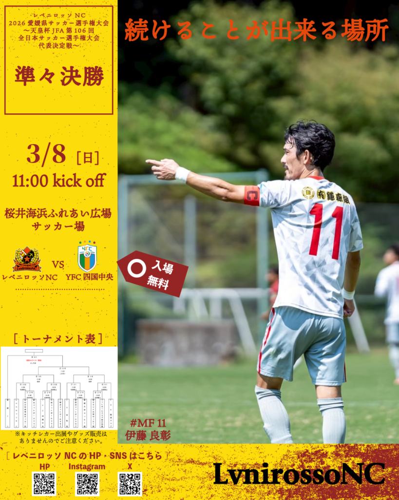 【試合情報】2026愛媛県サッカー選手権大会 準々決勝 2026-03-052026-03-05 日頃より、レベニロッソNCへご支援いただき、ありがとうございます。 試合予定をご案内いたします。 日 時:2026年3月8日(日)11時00分キックオフ 対戦相手:YFC四国中央 会 場:桜井海浜ふれあい広場サッカー場 昨年まで四国リーグに所属していた相手に対して、自分たちのサッカーをどこまで発揮できるか。 お互い手の内がわかっている分難しい試合にあると思いますが、一生懸命勝利に向かって戦います。 ご声援よろしくお願いいたします。 投稿ナビゲーション PREVIOUS Previous post: 【試合結果】2026愛媛県サッカー選手権大会 2回戦