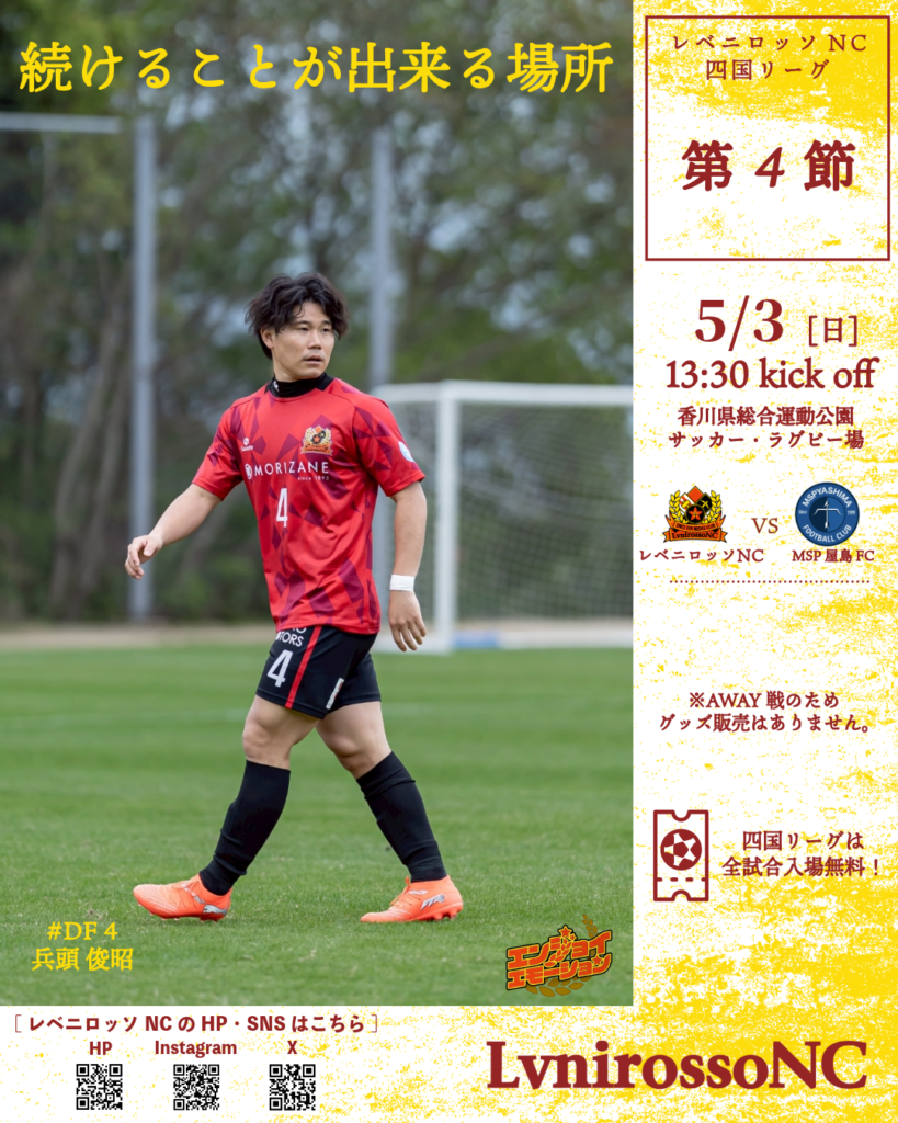 【試合情報】第50回四国サッカーリーグ 第4節 2026-04-302026-04-30 日頃より、レベニロッソNCへご支援いただき、ありがとうございます。 試合予定をご案内いたします。 日 時:2026年5月3日(日)13時30分キックオフ 対戦相手:MPC屋島FC 会 場:香川県総合運動公園サッカー・ラグビー場 今シーズン昇格してきた相手で未知数ではありますが、自分たちのサッカーができれば必ず勝利することが出来ます。開幕4連勝を目指して最後まで走り切って勝利を掴みます! ゴールデンウイーク真っ只中ですが、現地での応援よろしくお願いいたします! 投稿ナビゲーション PREVIOUS Previous post: 【試合結果】第62回全国社会人サッカー選手権大会 愛媛県大会2回戦